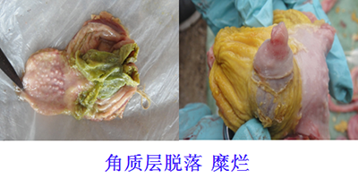 谷鳳柱教授還說,肌胃炎多和腺胃炎同時(shí)發(fā)生,但也可單獨(dú)發(fā)生,且對(duì)雞的危害大于腺胃炎。由于病因不同,臨床肌胃角質(zhì)層的病理變化也不盡相同。臨床上經(jīng)常看到肌胃角質(zhì)層的糜爛、崩解一定是發(fā)生了肌胃炎,但角質(zhì)層沒有糜爛不一定不是肌胃炎,要認(rèn)真辯證分析。如果發(fā)現(xiàn)角質(zhì)層已經(jīng)發(fā)生褪色、變淡,那么我們就應(yīng)該注意了。