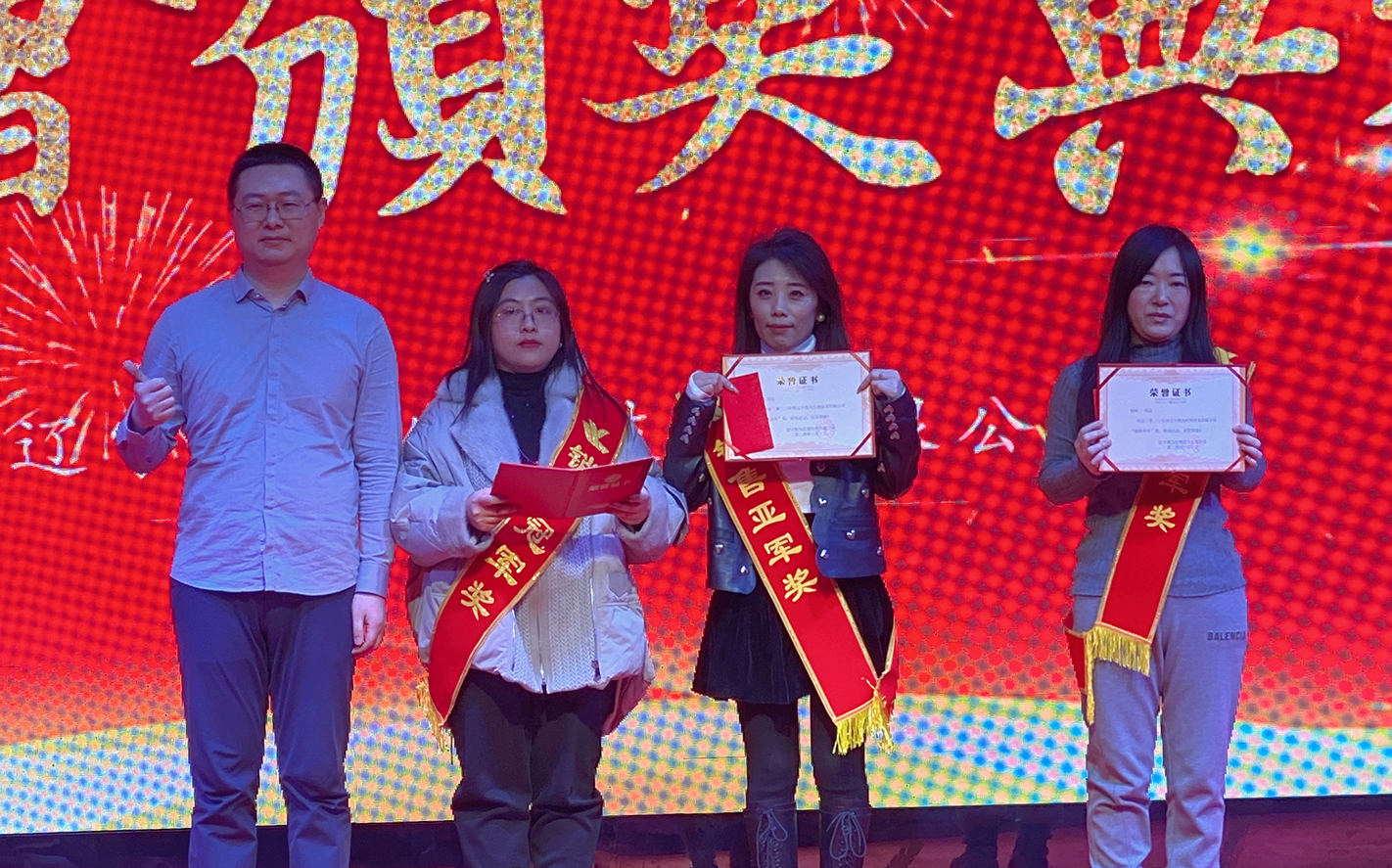 周瑜獲得集團事業部2023年度超目標獎、集團事業部年度銷售冠軍獎;李榮久獲得集團事業部2023年度超目標獎;邵丹獲得集團事業部2023年度超目標獎。嘉賓李占忠先生、總經理王鐵良先生為獲獎者頒獎。